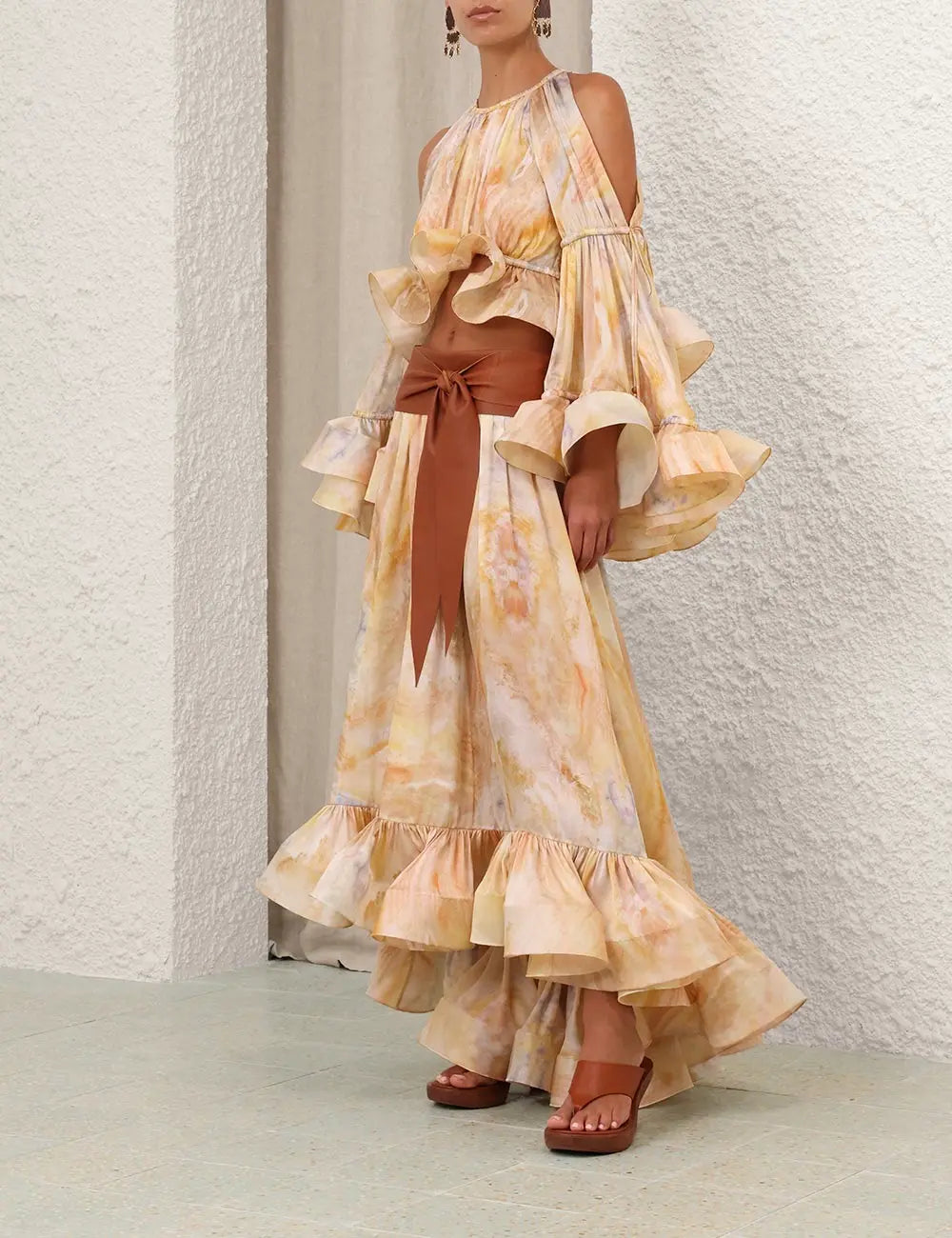 The Balance Flounce Blouse in Honey Agate from our Spring 2025 Collection, Illumination. A cropped blouse featuring statement frill detailing on hemline and cuffs, heavy gathers into rounded neckline and open shoulder details.