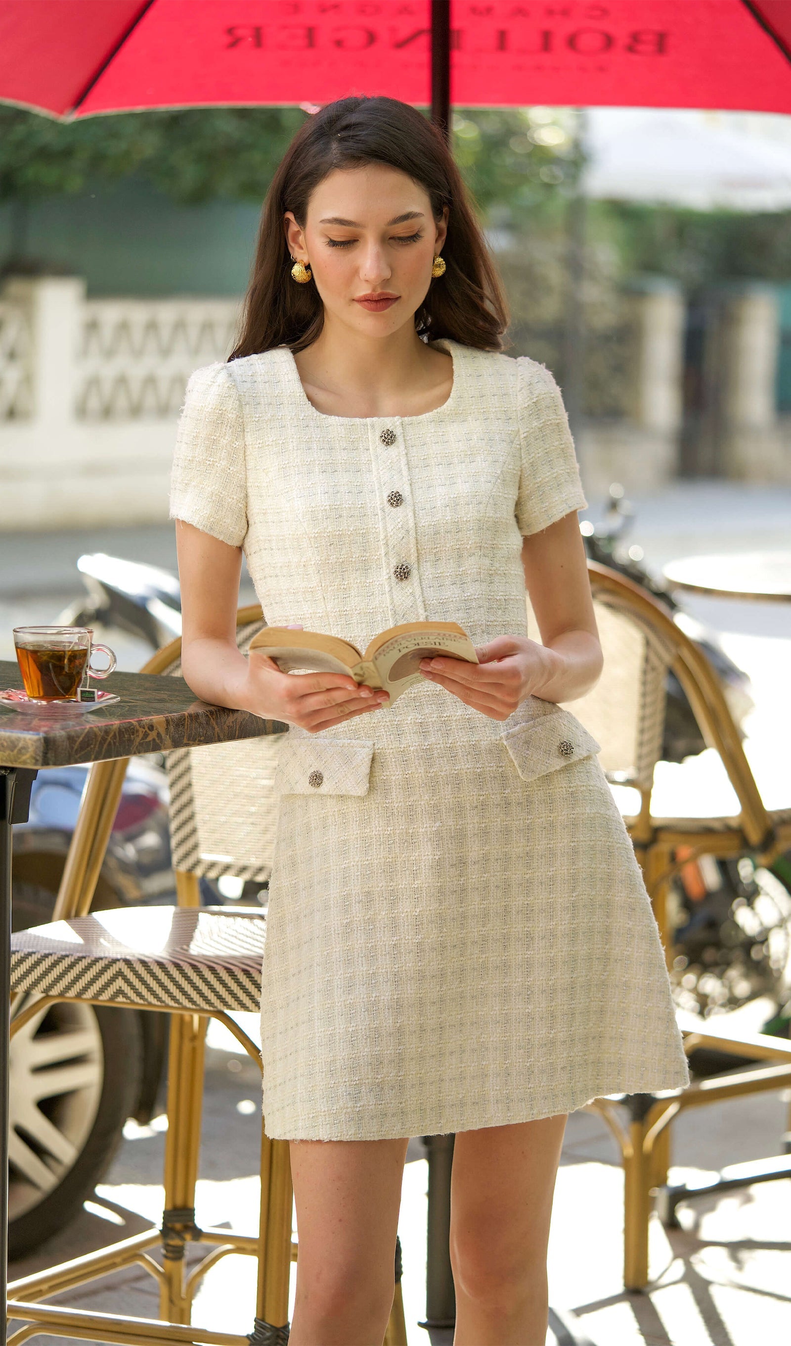 Crafted from an upcycled melange of wool and cotton tweed, this dress showcases faux pocketing and decorative front buttons framed by short sleeves. The functional zipper closure at the back ensures a secure and comfortable fit.