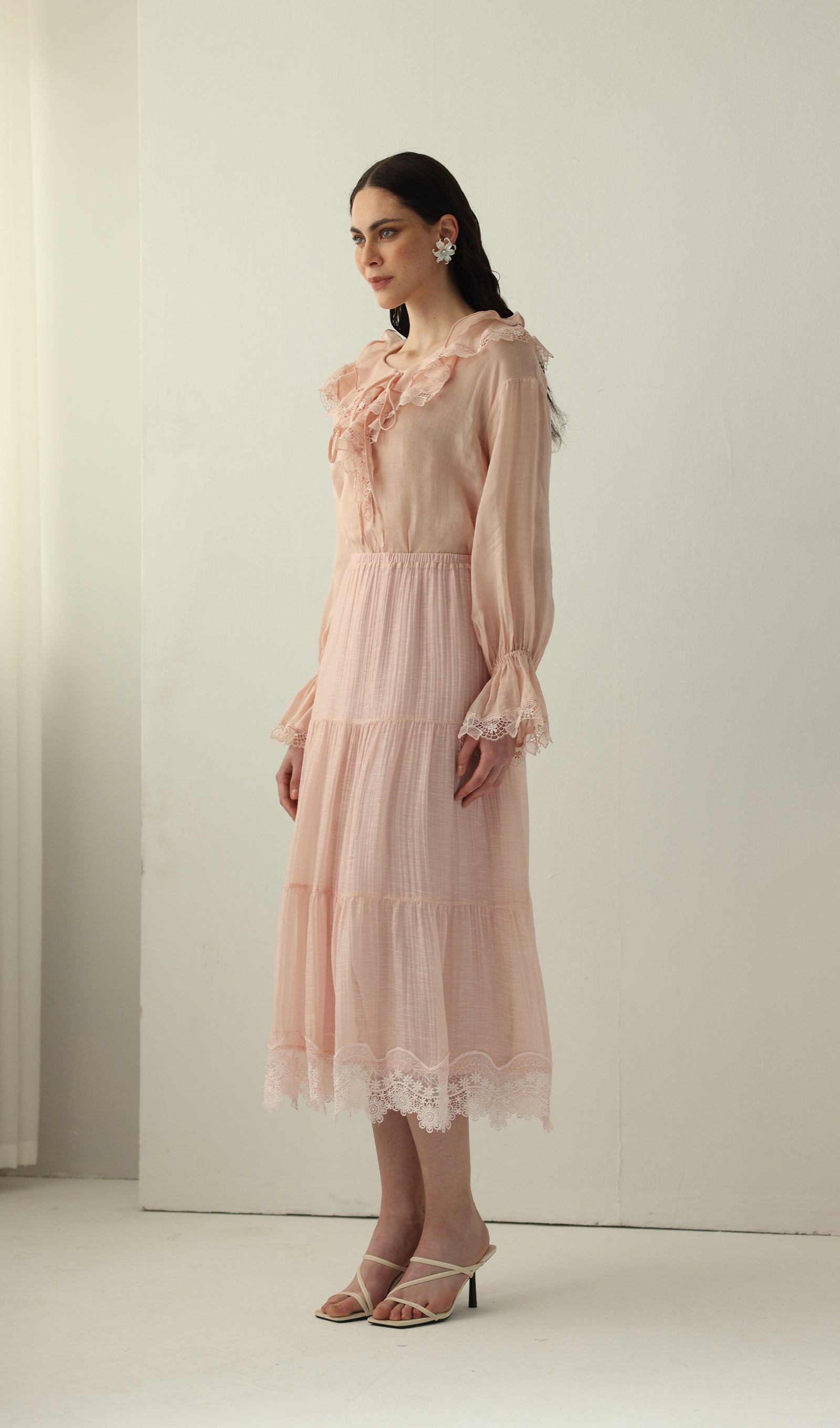 This elegant V-neck top features delicate lace panels and ruffled accents, adding a touch of femininity to any outfit. Crafted from soft and breathable fabric, it offers both style and comfort for everyday wear. Perfect for dressing up or down, this top is a versatile addition to any wardrobe.