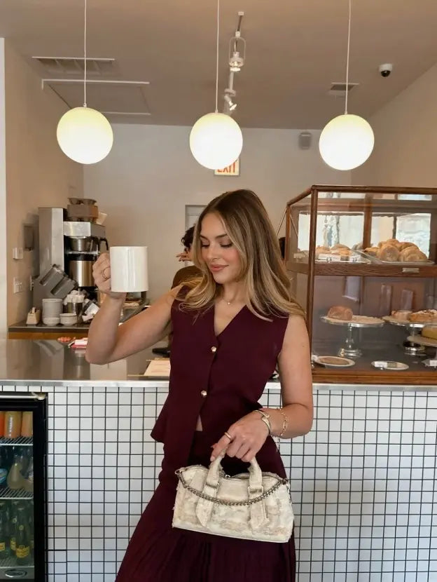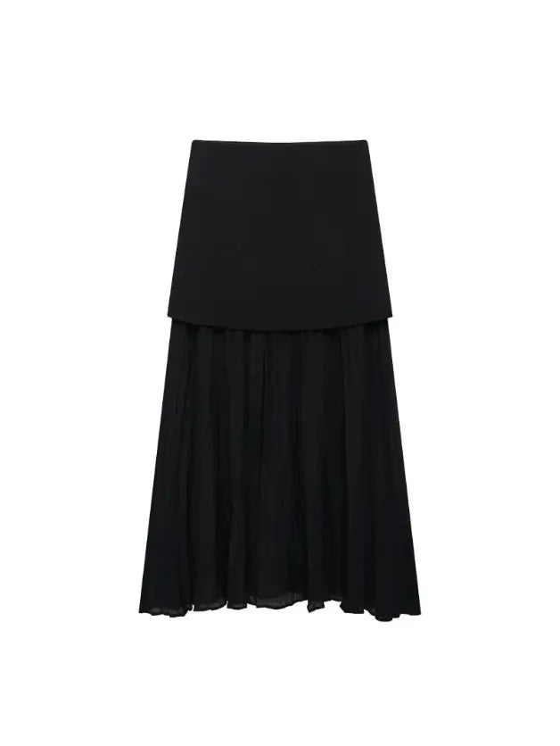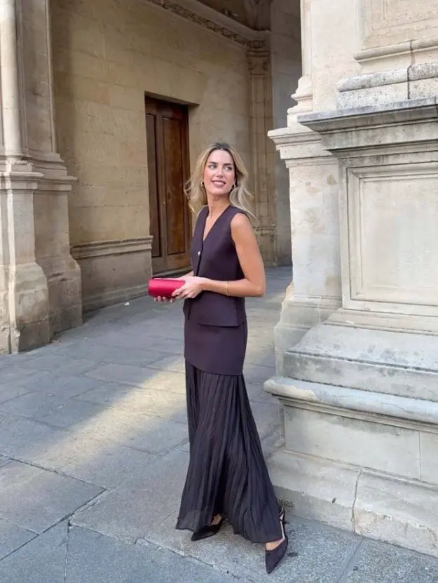 Vest-Style V-Neck Top & Mesh-Panel Skirt Set