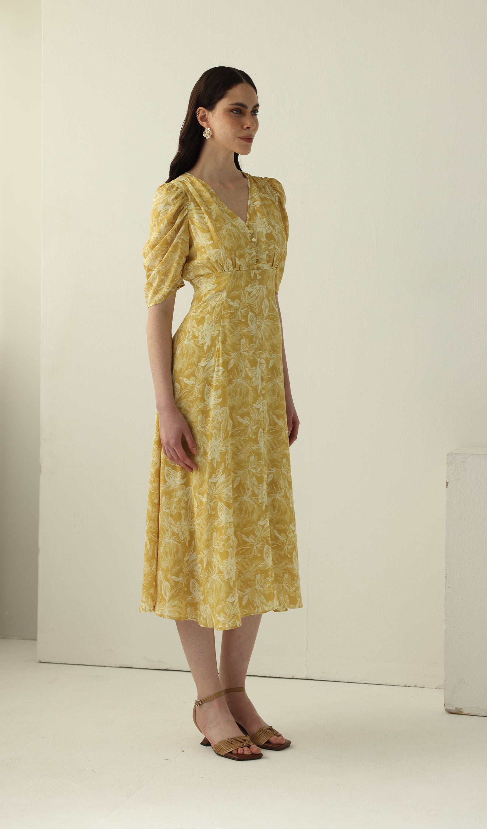 Discover the perfect blend of style and comfort with our Yellow Floral Printed V Neck Midi Dress. Featuring a flattering V neckline and long sleeves, this dress is made with a soft and flowy fabric for all day wear. The intricate floral print adds a touch of elegance, while the button detailing adds a hint of sophistication. Elevate your wardrobe with this stunning midi dress.