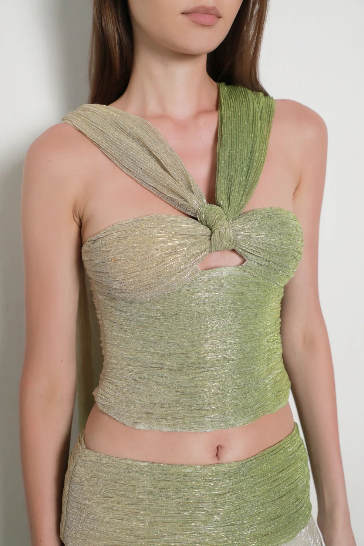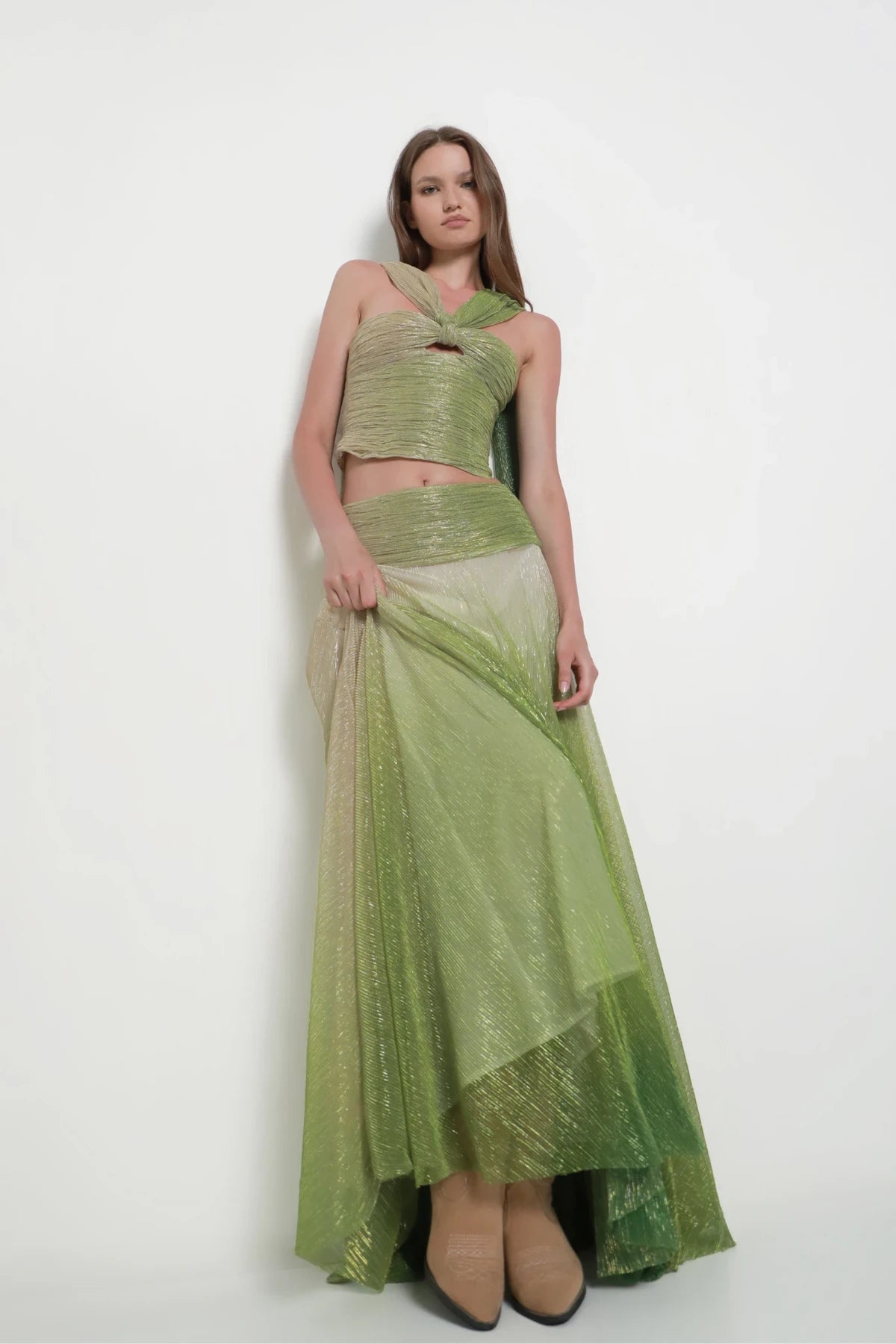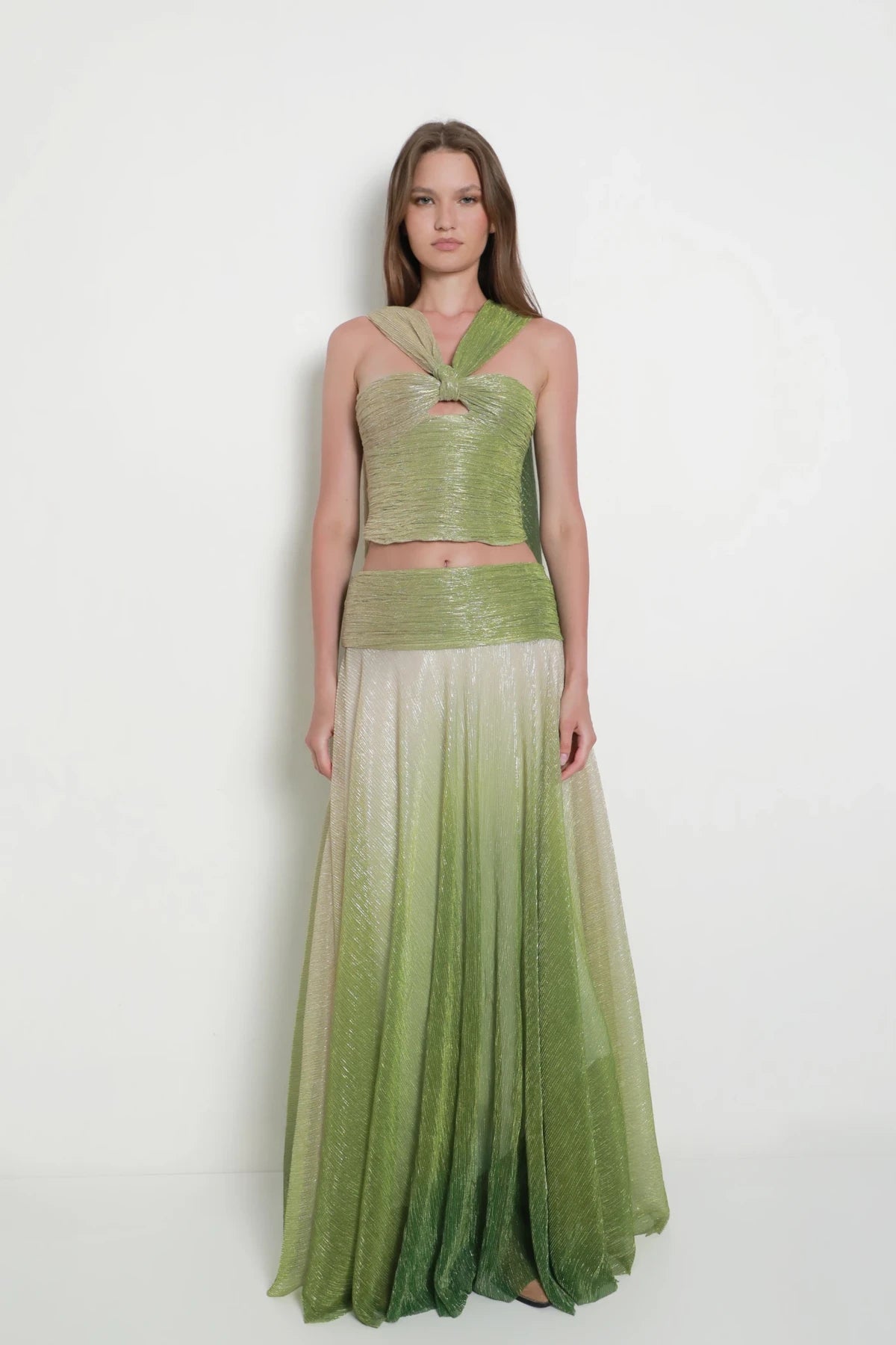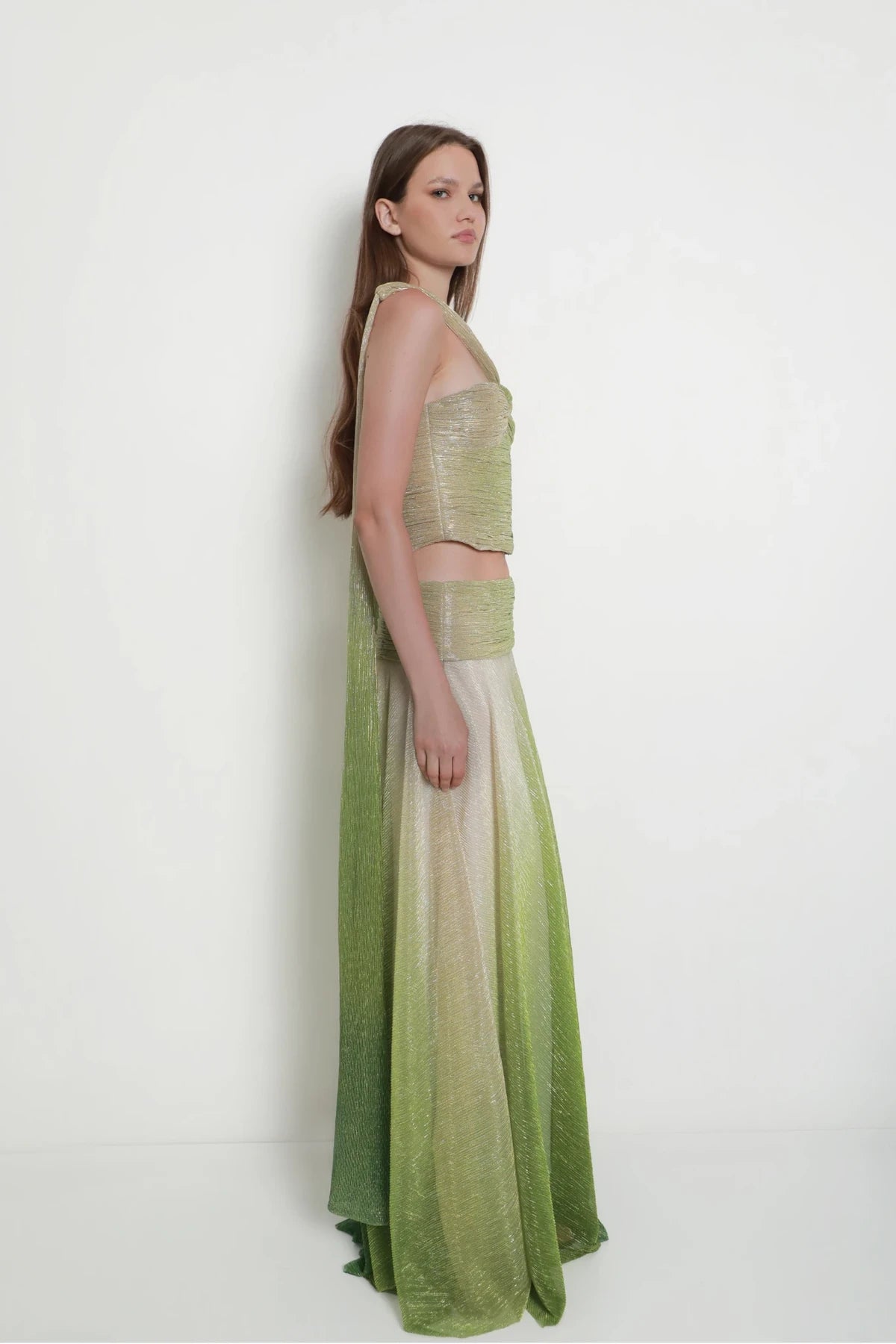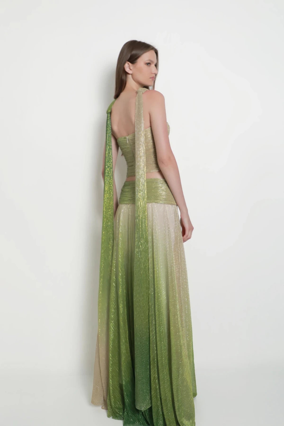 The top features a sculpted twist detail at the chest, creating a defined cutout thatdraws the eye upward to a single strap wrapping elegantly around the neckdescending down the back. A matching floor-length skirt to complete the look. Theset is crafted from a shimmering fabric that fades seamlessly from greige to green,creating a sophisticated gradient effect that catches the light with every movement